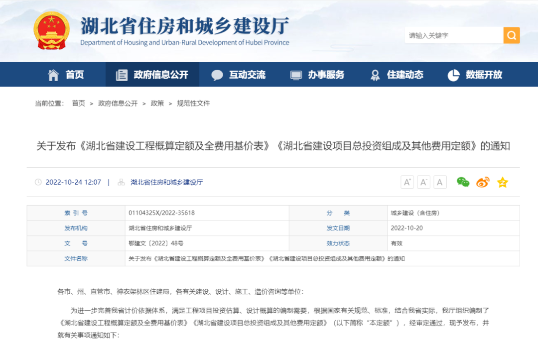 2.湖北省住建廳發(fā)布《湖北省建設工程概算定額及全費用基價表》《湖北省建設項目總投資組成及其他費用定額》的通知