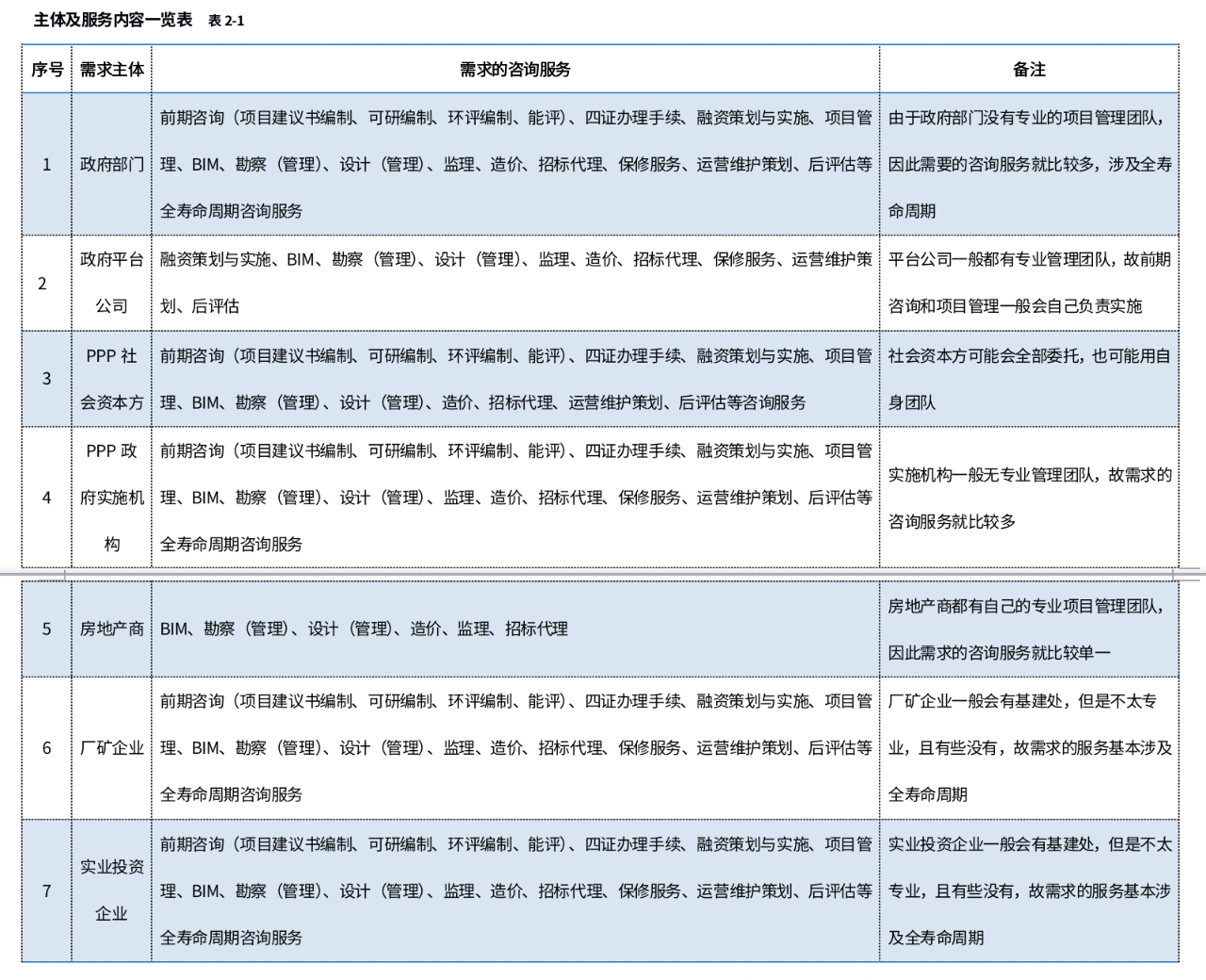 不同的投資主體對(duì)全過程咨詢需求的服務(wù)內(nèi)容是不一樣的,一是因?yàn)橥顿Y主體本身性質(zhì)的不同,法律法規(guī)所規(guī)定的也不一樣,二是投資主體自身團(tuán)隊(duì)管理水平的因素所需求的咨詢服務(wù)也不一樣,以下通過表格列述不同的主體所需求的咨詢服務(wù):