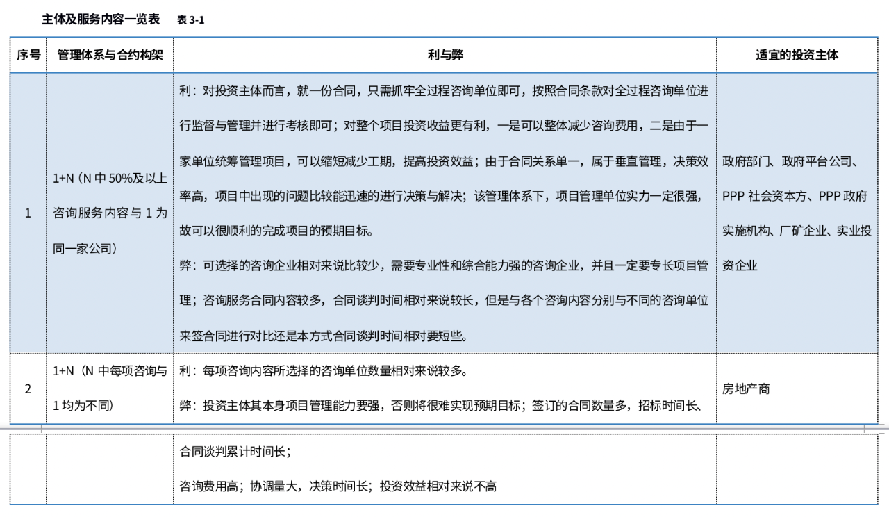 不同的投資主體所需的服務(wù)內(nèi)容和管理模式不一樣,就會(huì)導(dǎo)致項(xiàng)目管理體系上和合約構(gòu)架上不一樣,以下通過表格闡述不同的管理體系和合約構(gòu)架的利與弊及適宜的投資主體(本文倡導(dǎo)的全過程咨詢以項(xiàng)目管理為主線,用1表示,前期咨詢、監(jiān)理、造價(jià)、招標(biāo)代理、勘察設(shè)計(jì)管理等用N表示):