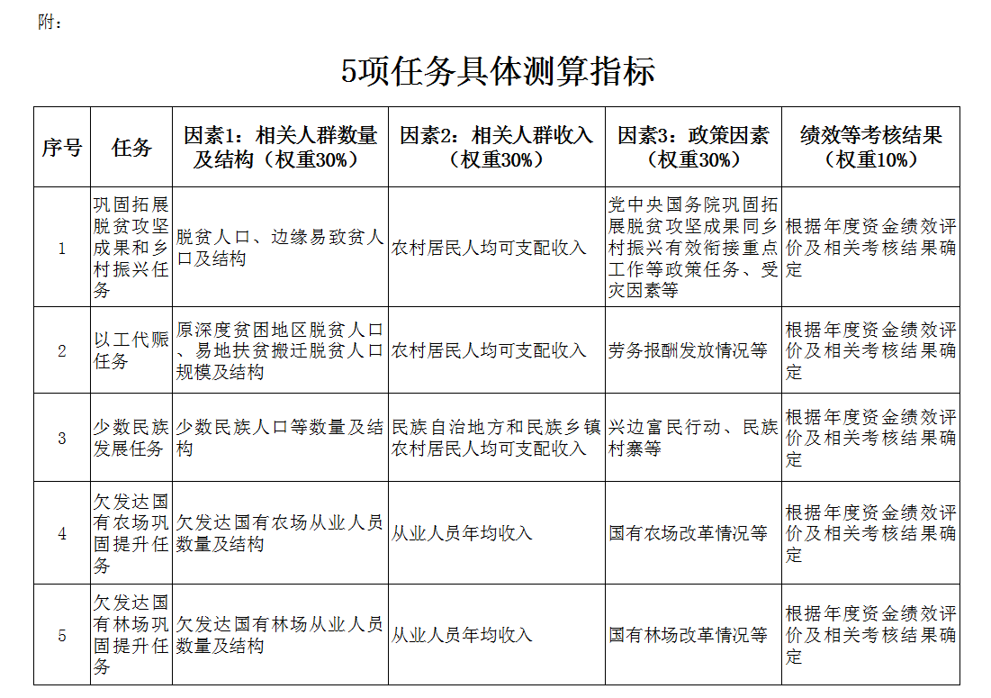 第二條 銜接資金按照鞏固拓展脫貧攻堅(jiān)成果和鄉(xiāng)村振興、以工代賑、少數(shù)民族發(fā)展、欠發(fā)達(dá)國有農(nóng)場(chǎng)鞏固提升、欠發(fā)達(dá)國有林場(chǎng)鞏固提升、“三西”農(nóng)業(yè)建設(shè)任務(wù)進(jìn)行分配。資金分配按照因素法進(jìn)行測(cè)算,因素和權(quán)重為:相關(guān)人群數(shù)量及結(jié)構(gòu)30%、相關(guān)人群收入30%、政策因素30%、績(jī)效等考核結(jié)果10%,并進(jìn)行綜合平衡。各項(xiàng)任務(wù)按照上述因素分別確定具體測(cè)算指標(biāo)(詳見附件)?!叭鳌鞭r(nóng)業(yè)建設(shè)任務(wù)按照國務(wù)院批準(zhǔn)的規(guī)模安排。