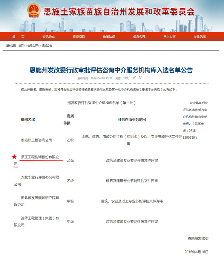 【經(jīng)營成果】我司入圍恩施州發(fā)改委行政審批評估咨詢中介服務機構庫