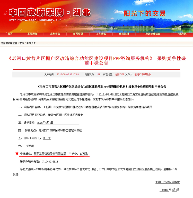 【經營成果】我司中標老河口市黃營片區(qū)棚戶區(qū)改造綜合功能區(qū)建設項目PPP咨詢服務機構編制競爭性磋商項目