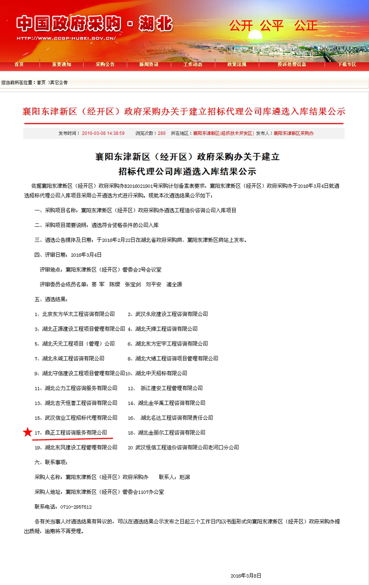 【經(jīng)營(yíng)成果】我司入圍襄陽東津新區(qū)(經(jīng)開區(qū))政府采購辦招標(biāo)代理公司庫