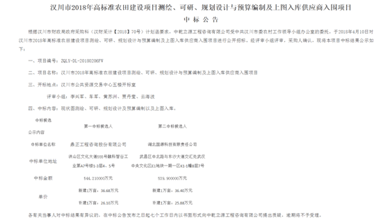 2018年4月11日,我司中標(biāo)“漢川市2018年高標(biāo)準(zhǔn)農(nóng)田項目”,該項目位于湖北省漢川市,項目規(guī)模約17萬畝,對漢川市2018年高標(biāo)準(zhǔn)農(nóng)田建設(shè)項目進行測繪、可行性研究、規(guī)劃設(shè)計與預(yù)算編制,中標(biāo)金額為544.21萬元,中標(biāo)單價為新建1萬畝(36.68萬元)和補建一萬畝(26.10萬元)。