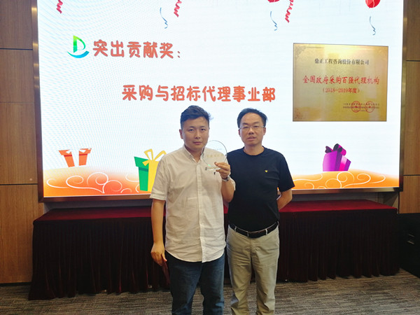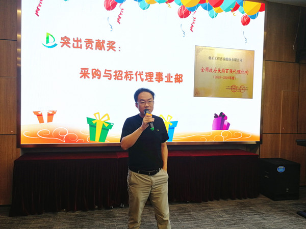 值得一提的是,今年七月我司憑借專業(yè)的服務、完善的內(nèi)控制度從近千家政府采購代理機構(gòu)中脫穎而出,獲得首屆“全國政府采購百強代理機構(gòu)(2018-2019年度)”榮譽稱號,這一榮譽稱號離不開采購與招標事業(yè)部全體成員積極主動的參評。董事長王雁然為采購與招標事業(yè)部頒發(fā)突出貢獻獎,并號召大家向采購與招標事業(yè)部學習大局意識和吃苦耐勞的工作作風。