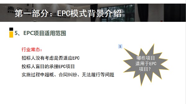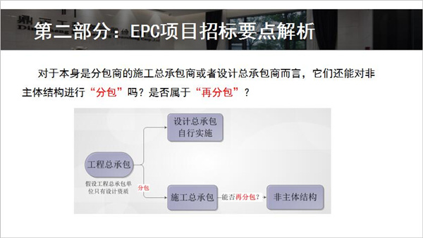下午,采購與招標代理事業(yè)部的潘勝強帶來了《EPC項目招標實務(wù)》的主題培訓(xùn)。潘勝強首先介紹了EPC模式的背景,包含工程總承包的主要模式,EPC發(fā)展?fàn)顩r,EPC項目適用范圍,招標流程等多方面內(nèi)容。隨后對EPC項目招標要點進行了解析,結(jié)合相關(guān)政策文件對工程總承包發(fā)包階段和條件、資格條件的設(shè)置、EPC項目前期單位是否可以參與后期投標、合同計價方式、分包原則進行了詳細的解讀。