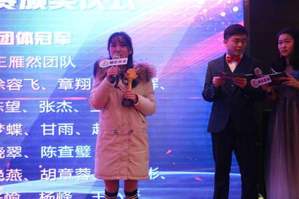 ▲副總毛迎霞為團(tuán)體冠軍頒獎(jiǎng),胡章蓉代表發(fā)言