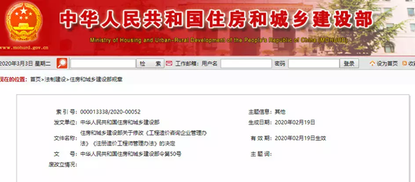 2020年3月3日,住建部50號(hào)令“住房和城鄉(xiāng)建設(shè)部關(guān)于修改《工程造價(jià)咨詢(xún)企業(yè)管理辦法》《注冊(cè)造價(jià)工程師管理辦法》的決定”一夜間在工程咨詢(xún)行業(yè)引發(fā)了激烈的討論。