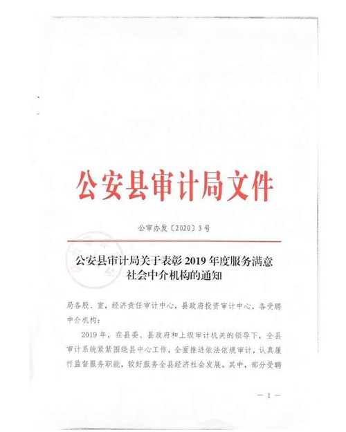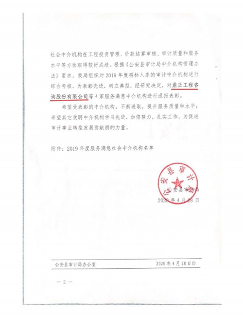 自2019年7月1日鼎正咨詢成為公安縣審計局的入庫合作單位以來,荊州分公司同事們在工程竣工結算審計過程中,精心組織、合理安排、嚴于律己、廉潔從審,在確保重點工程順利推進、節(jié)約政府資金、提高投資效益等方面做出了突出貢獻,得到了公安縣相關單位的一致好評,為公司贏得了信譽。