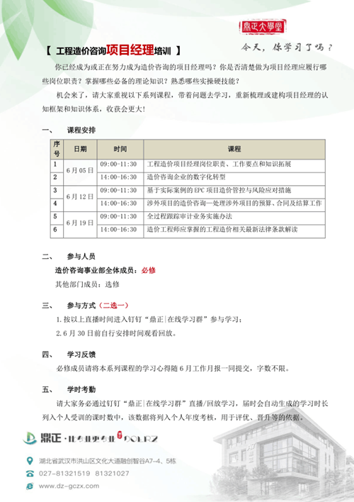 鼎正在6月份組織同事在線學習中價協(xié)舉辦的《工程造價咨詢企業(yè)項目經(jīng)理網(wǎng)絡直播培訓》課程。